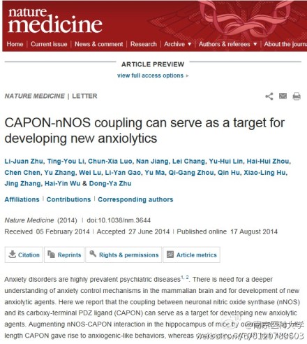 近日,Nat Med(当年影响因子28.054)在线发表了我院朱东亚教授等题为“CAPON-nNOS耦联可作为研发新型抗焦虑药的靶点”(CAPON-nNOS coupling can serve as a target for developing new anxiolytics )的研究论文。研究者发现神经元型一氧化氮合酶(nNOS)和nNOS的PDZ结构域的羧基末端配体蛋白(CAPON)结合可以作为开发新型抗焦虑药的一个靶点。