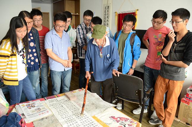 看到同学们的到来,老兵们非常激动。在同学的轻声问询下,他们一一打开思绪,老兵们有的口述,有的对着回忆文章解读,低沉的声音、凝思的神情,似乎又回到了那段激情燃烧的岁月。老兵曾宪高,曾在黄浦军校受训,参加了多场对日作战,他特别回顾了淞沪抗战惨痛经历,他说,当时战场异常惨烈,真是“热血染山河”。其中一位原籍连云港的老兵,详细讲述了他在当地参战的故事情节,艰难苦困的环境和坚定的信念深深的感染了同学们。