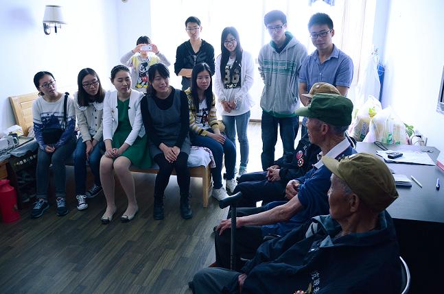 当天上午,学生党员和学生代表一行20多人见到了3位90高龄但依旧精神矍铄的抗战老兵,尽管临行前已对老人的情况有所了解,但面见老人们后,同学们是满满的感动和钦佩:头戴发黄军帽,胸前整齐别着纪念勋章,朴素的衣着,整齐的坐成一排。“这就是久经沙场,打败了小鬼子的抗战老兵”,一个共同的声音在同学们胸中想起。