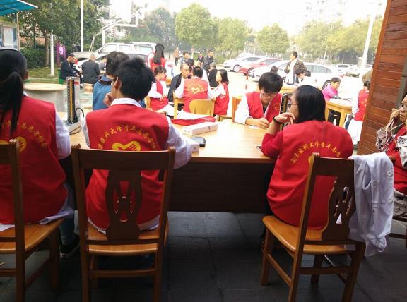 2015年10月24日,药学院青协的同学早晨7点准时从学校出发,前往天景山小区花景苑为居民量血压并宣传血压知识。