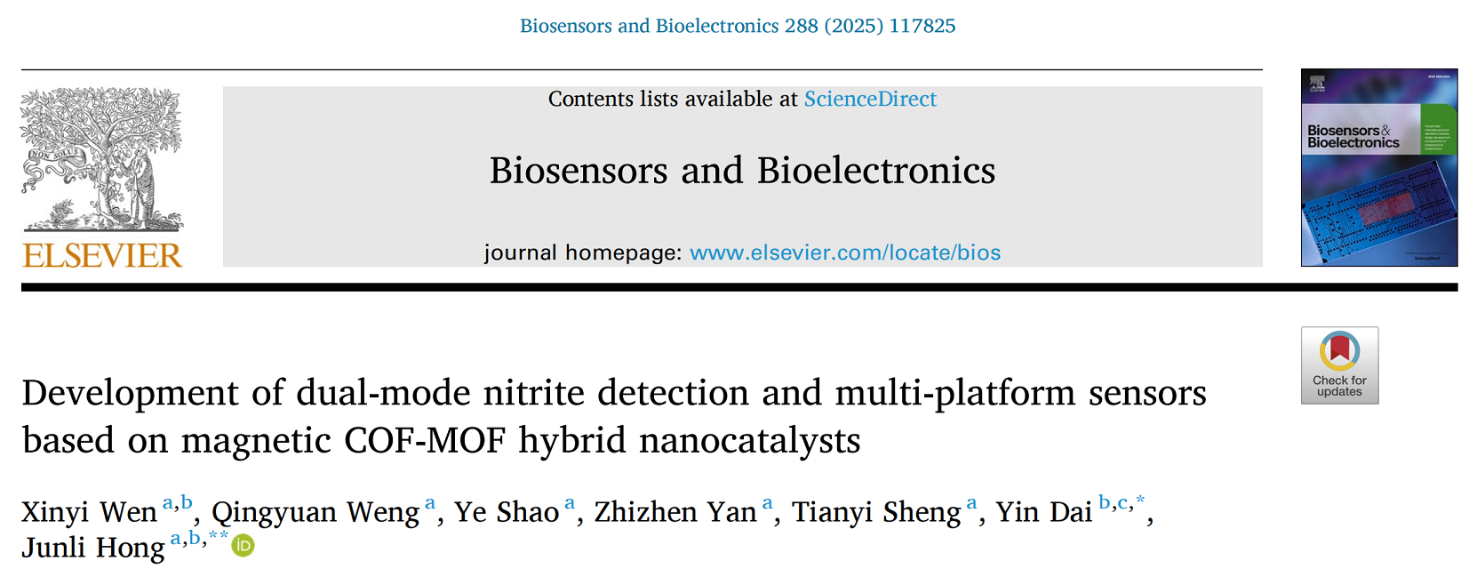 近日,南京医科大学药学院洪俊丽课题组在国际著名学术期刊Biosensors and Bioelectronics(中科院一区)发表题为“Development of Dual-Mode Nitrite Detection and Multi-Platform Sensors Based on Magnetic COF-MOF Hybrid Nanocatalysts”的研究论文。
