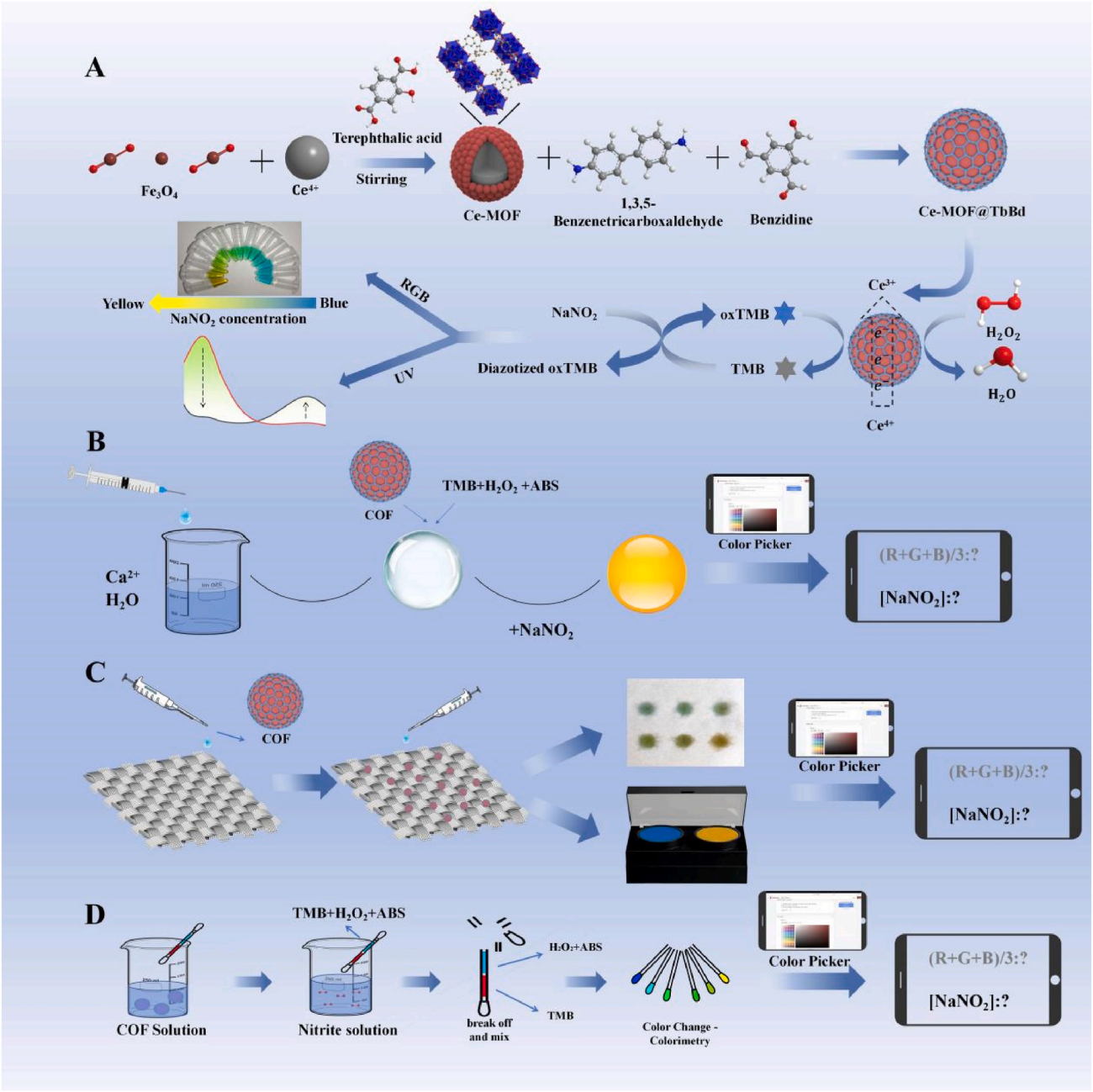 本研究通过整合共价有机框架(TbBd COFs)与金属有机框架(Fe3O4/Ce-MOFs)材料,构建了一种高性能的复合模拟过氧化物酶。该纳米酶可特异性催化亚硝酸盐的TMB显色-重氮化级联反应,实现了人血清、环境水体和食品样本中亚硝酸盐的高灵敏定量分析。基于此原理,本研究进一步开发了三种便携式生物传感器,其中水凝胶传感利用离子交联策略调控显色反应,显著提升反应灵敏度与稳定性,可实现现场精准定量分析;棉织物传感利用纤维素基底的毛细作用与高吸附特性,有效降低复杂基质干扰,实现样品原位高效富集与信号同步读取;脱脂棉基传感借助医用脱脂棉的三维多孔结构,通过控制轴向流动实现待测物快速渗透、分子富集及试剂自混合,展现出优异的现场诊断(POCT)潜力。