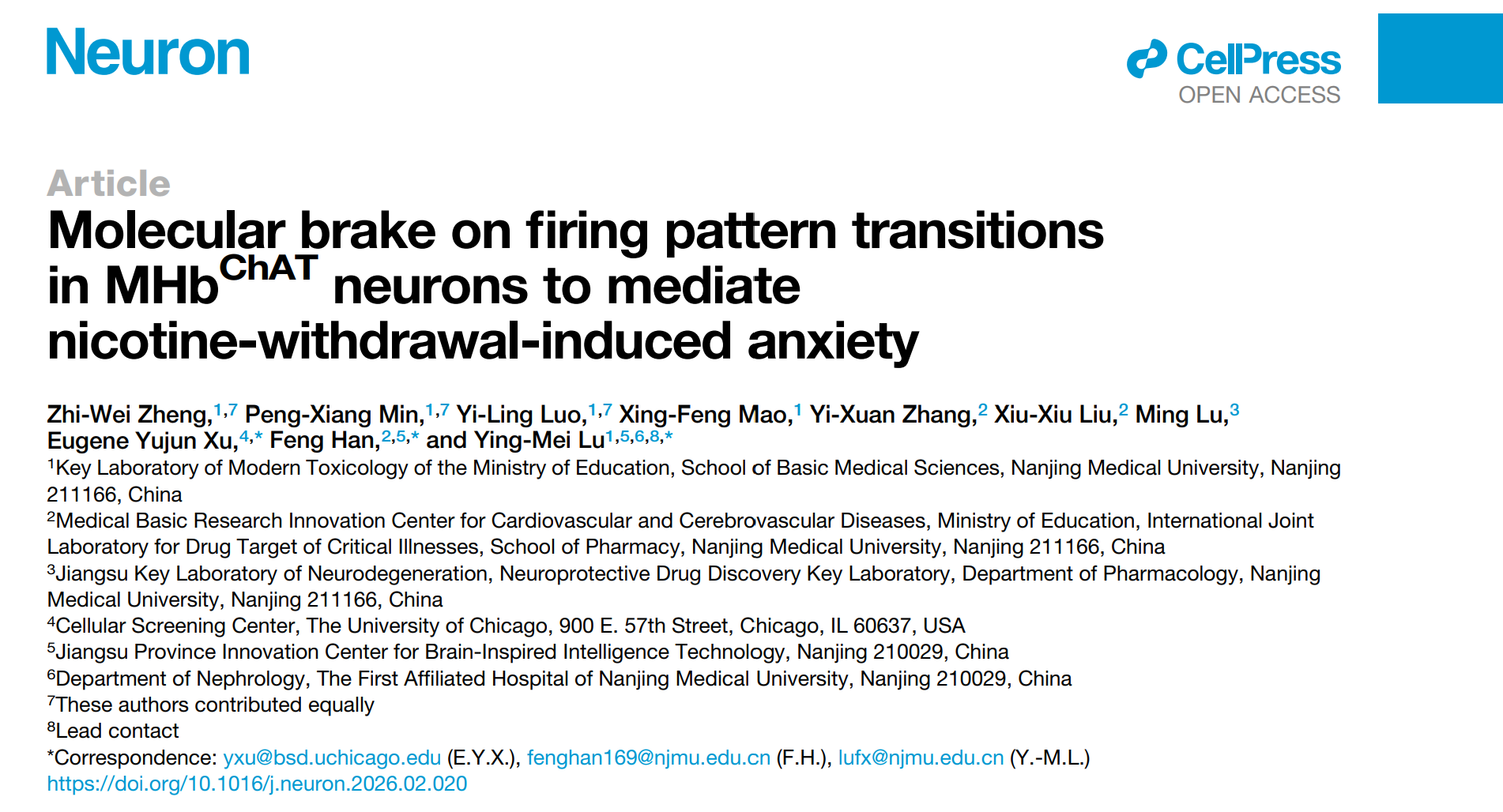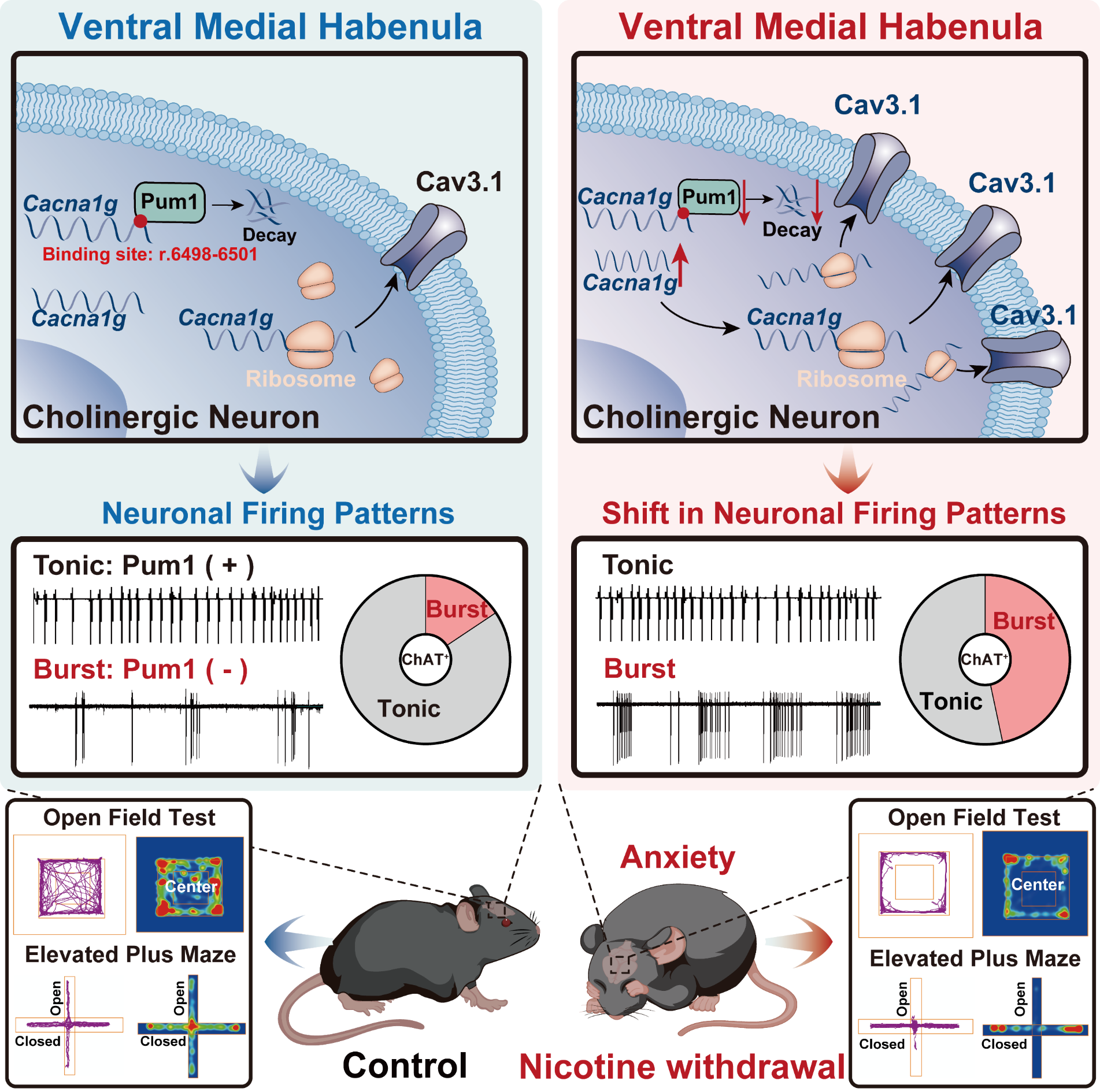 药学院韩峰教授课题组联合南京医科大学基础医学院卢应梅教授、美国芝加哥大学徐宇君教授在Neuron杂志上发表了题为“Molecular brake on firing pattern transitions in MHbChAT neurons to mediate nicotine withdrawal-induced anxiety”的研究成果。该研究以内侧缰核为切入点,围绕焦虑障碍的电生理与分子机制开展系统研究。研究发现,内侧缰核腹侧区域乙酰胆碱能(vMHbChAT)神经元的放电模式发生显著转变,这一变化在焦虑行为的产生中发挥关键作用。进一步机制研究表明,RNA结合蛋白Pum1通过调控T型钙通道Cav3.1的表达,参与调节神经元放电模式,从而介导焦虑情绪的发生。本研究从神经元放电模式的角度深化了对焦虑发生机制的认识,并为靶向神经电活动调控的精准干预策略提供了新的理论依据和潜在靶点。