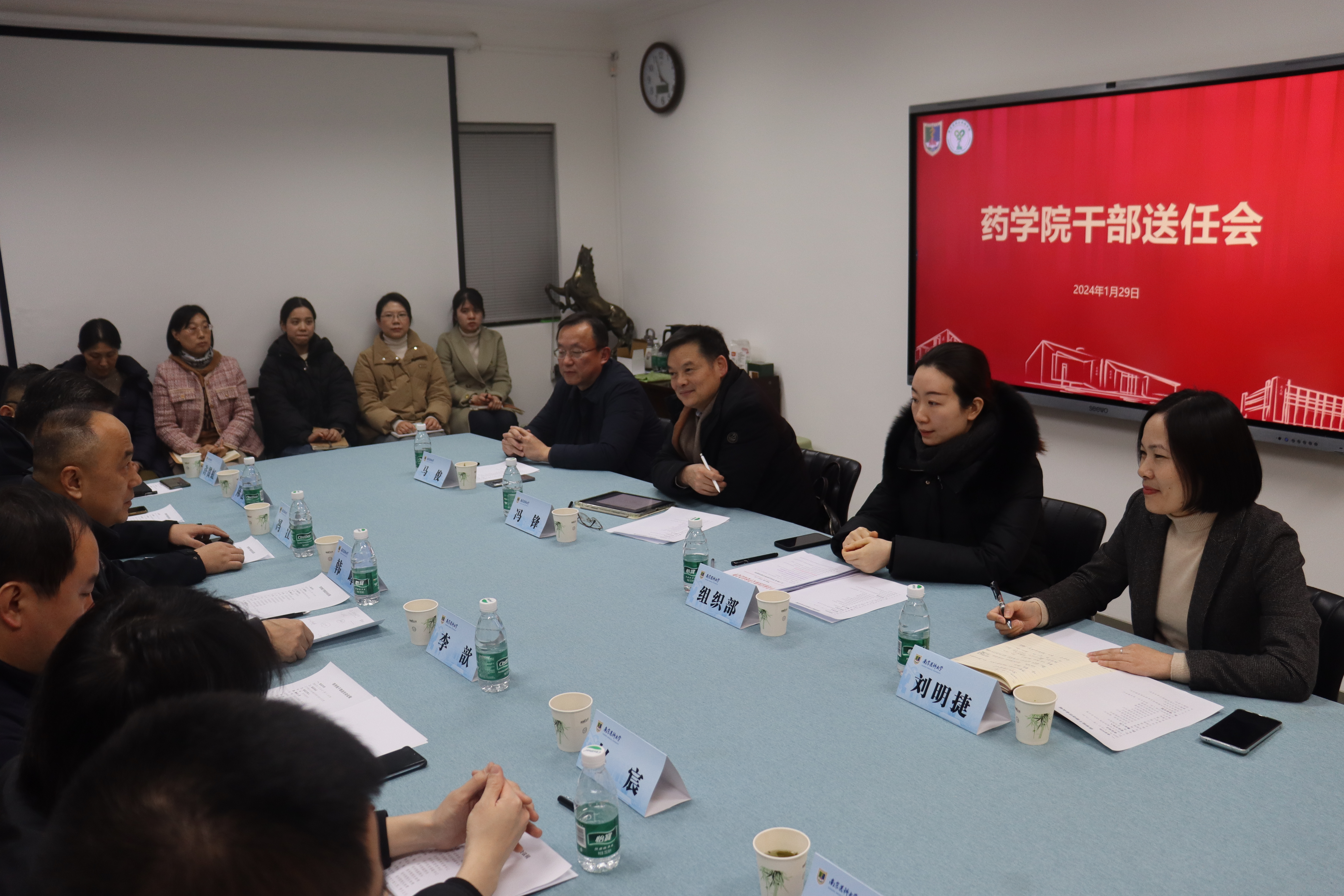 校党委组织部党校办公室主任周丽丽宣读了中共南京医科大学委员会关于马俊同志和刘明捷同志职务任免的通知,宣布刘明捷同志为药学院党委书记,马俊同志调整为护理学院党委书记,不再担任药学院党委书记职务。马俊同志表示坚决拥护学校党委的决定,对药学院师生一直以来给予他工作上的支持表示感谢,表示在未来的工作中会一如既往地关心、关注药学院的发展,祝愿学院事业发展行稳致远、蒸蒸日上。刘明捷同志衷心感谢学校党委的信任,对于此次工作调整,既感到使命光荣,又倍觉责任重大,表示将尽快转换工作角色和工作思路,加强学习,融入药学院大家庭,和学院师生一起努力,推动学院实现新的发展。院长韩峰代表学院班子表示坚决拥护学校党委决定,感谢马俊书记在学院期间的工作和付出,对刘明捷同志的加入表示欢迎和支持,表示学院新一届班子将在学校党委的指导和支持下继续履行职责,凝心聚力,带领和推动学院各项事业再上新台阶。