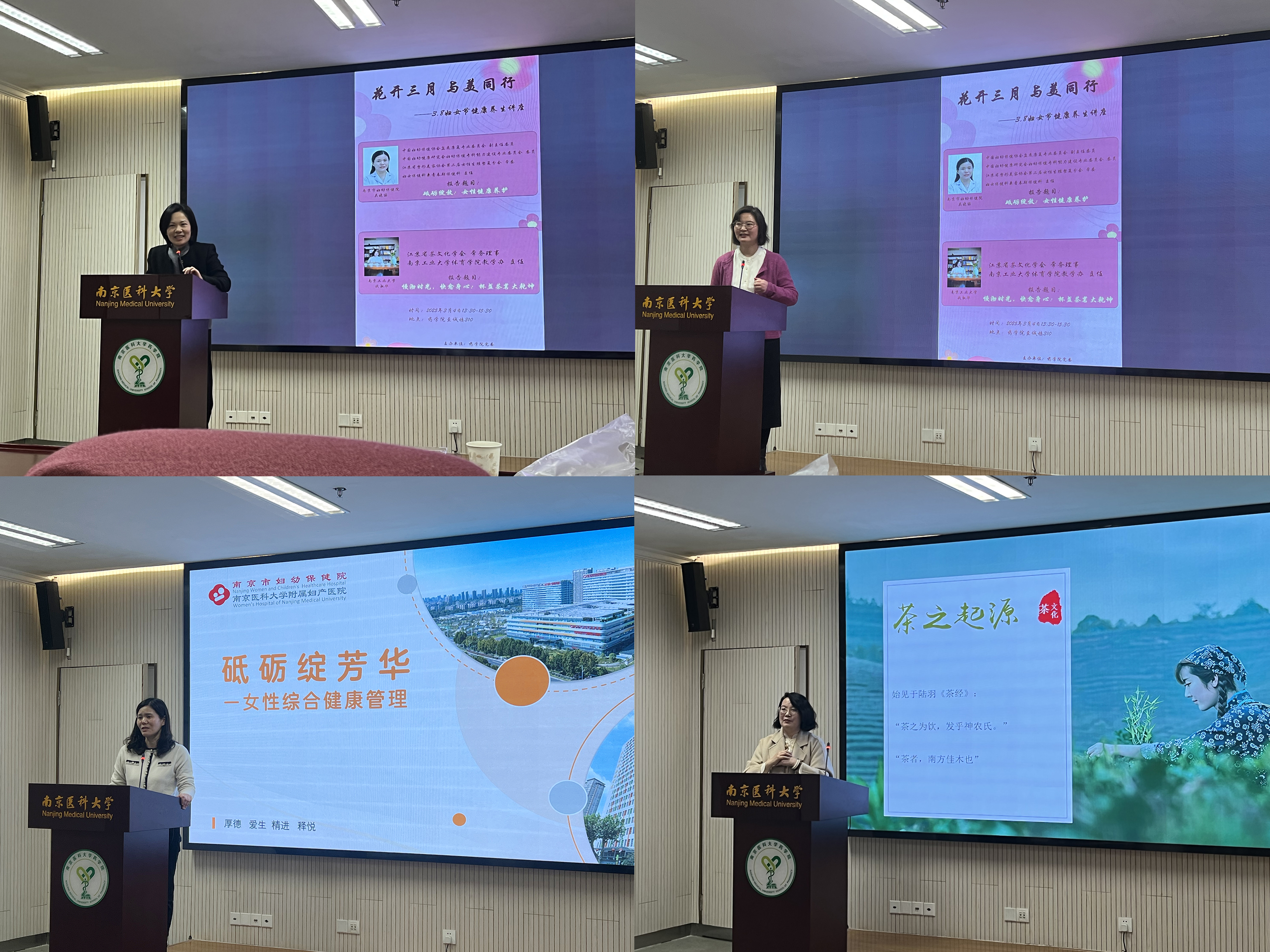 本次讲座特邀南京市妇幼保健院吴晓丽主任与南京工业大学战淑华主任担任主讲嘉宾。吴晓丽主任以《砥砺绽芳华——女性综合健康管理》为题,结合临床经验,从生理健康、保健知识、疾病预防等方面展开讲解,深入浅出地普及女性全生命周期健康管理知识,强调了预防和治疗相关慢性病的重要性。战淑华主任则以《慢沏时光,快愈身心——杯盏茶茗大乾坤》为主题,从茶文化的角度,阐述了品茶对身心健康的益处,介绍了茶的种类、冲泡技巧和品鉴方法。她强调,品茶不仅能够舒缓压力、调节情绪,还能促进身体健康,是一种值得推广的健康生活方式。